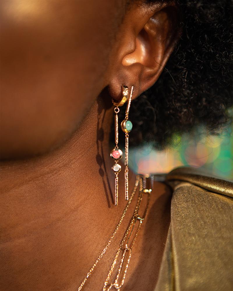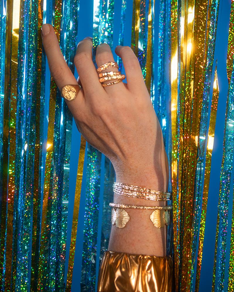 Tandis que les charms aux formes géométriques s’accrochent à nos créoles et à nos chaines, pour créer un volume indécent, ne répondant à aucune règle.