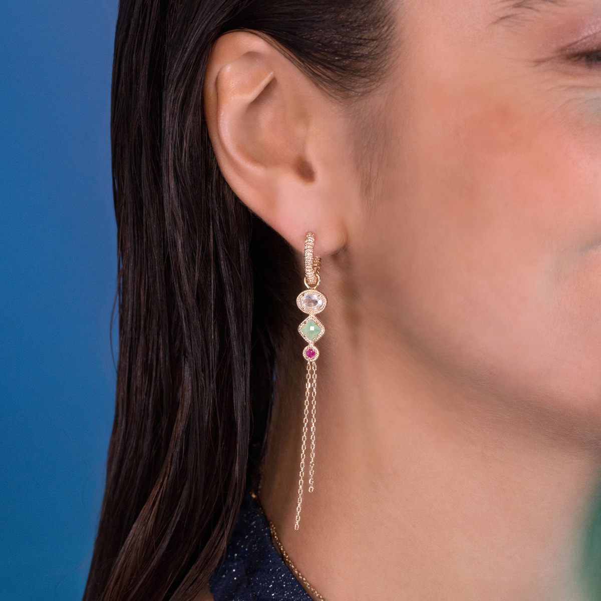 Les créoles COURTNEY ont tout pour plaire ! Avec leur texture scintillante, leurs 3 pierres fines et naturelles (améthyste verte, aventurine et un rubis), et leurs chaînes pendantes qui suivent chacun de vos mouvements, elles ajoutent une touche de magie à votre look. Pas de doute, ces créoles feront leur effet à chaque occasion !